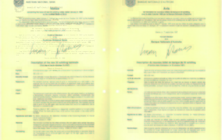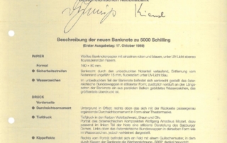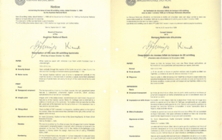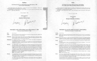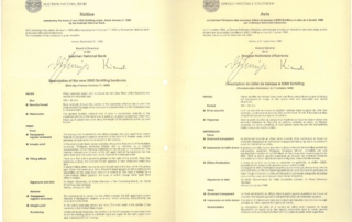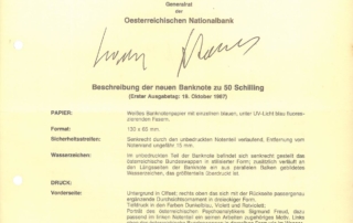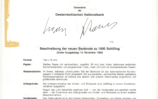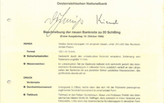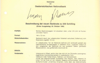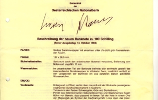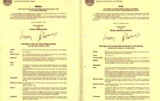 Patente und später Cirkulare wurden bei Ausgabe neuer Banknoten an Banken verschickt.  Beigelegt waren Bögen mit den Banknoten ähnlichen Ansichtsexemplaren, sogenannte Formulare, die über Aussehen und Sicherheitsmerkmale der Banknoten informierten. In Schilling Zeiten ab 1983 folgten sogenannte Bekanntmachungen, die den gleichen Zweck erfüllten.