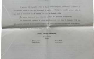 Für Kronen-Noten waren Verlautbarungen über neue Banknotenausgaben bisher nicht bekannt. Unten stehend wird ein italienischsprachiges „Avvertimento“ (Warnschreiben) abgebildet. Dieses wurde von der Österreichisch-ungarischen Bank verschickt und informiert auf 4 Seiten über das Aussehen der neuen Banknote. Es ist unklar, ob diese Verlautbarung eine einmalige Aktion blieb bzw. ob sie auch in anderen Sprachen stattfand..