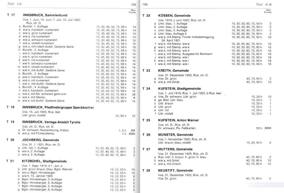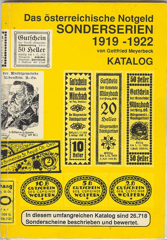 Es handelt sich um den Katalog: „Das österreichische Notgeld SONDERSERIEN 1919 – 1922 von Gottfried Meyerbeck“. Frühling 1989 – 154 Seiten. In DinA5. Der Katalog hat keine Bilder und auch keine Preise. Es ist eine Punktebewertung und eine „Buchstabenbewertung“, das heisst: R = selten, RR = sehr selten, RRR = äusserst selten und LP = Liebhaberpreis, gegeben. Es gibt ein Ortsverzeichnis, wo man ablesen kann, in welchem Bundesland der Ort liegt und ob auch „Normalscheine“ ausgegeben wurden. Dann sind die Orte pro Bundesland alphabetisch beschrieben.